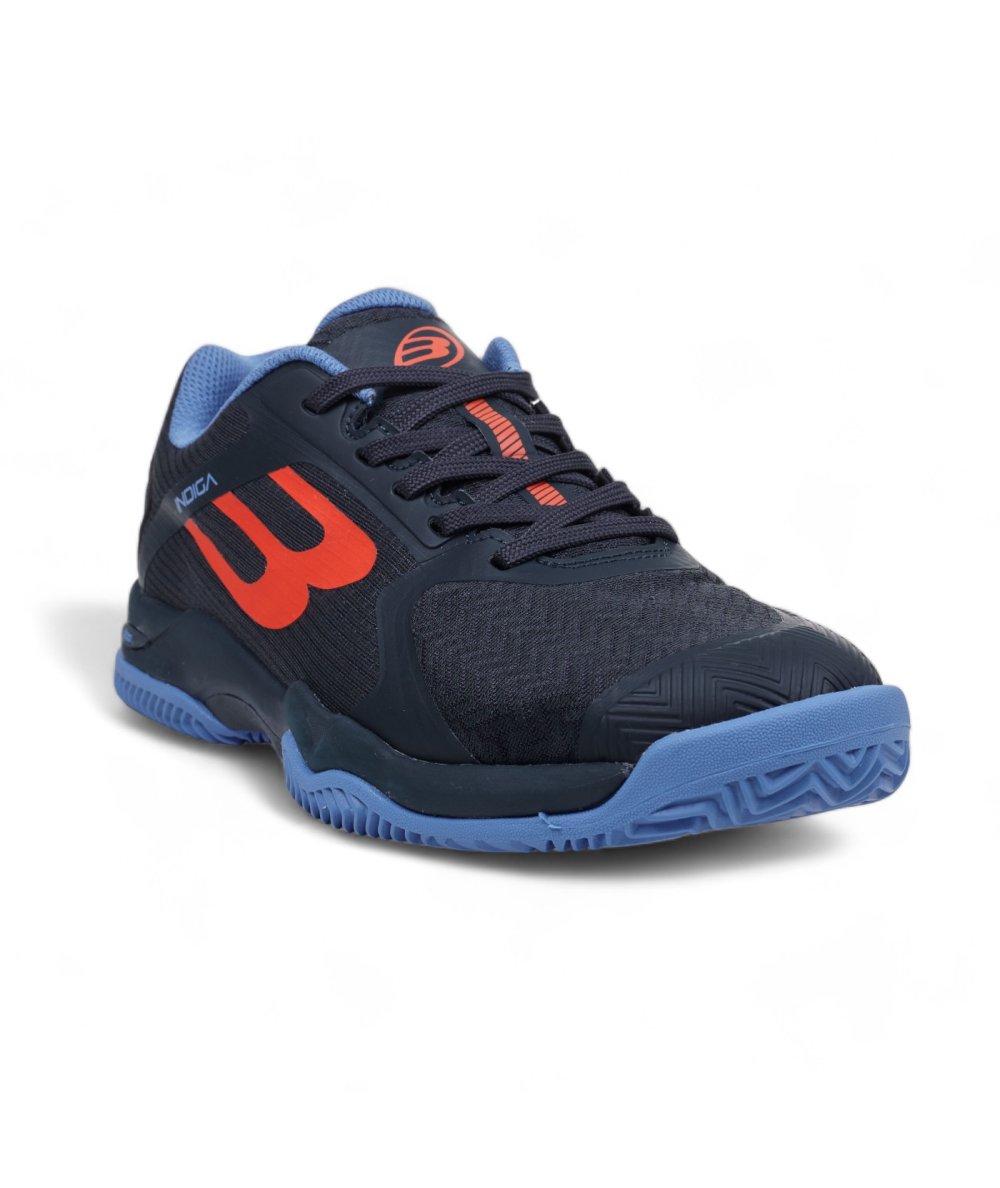 Zapatilla Bullpadel Indiga 25V azul marino adecuada para jugadores de pádel que buscan un calzado flexible y que priman sobre todo el agarre que proporciona una suela de espiga pura. El tejido tipo mesh aporta una transpirabilidad óptima.